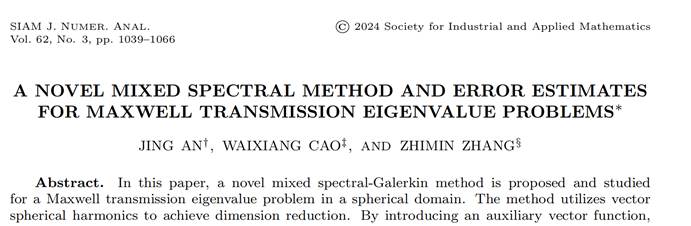 近日,公司安静教授与合作者在数学国际权威期刊SIAM Journal on Numerical Analysis上发表了题为“A NOVEL MIXED SPECTRAL METHOD AND ERROR ESTIMATES FOR MAXWELL TRANSMISSION EIGENVALUE PROBLEMS”的研究论文。