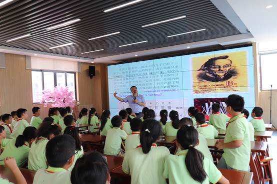 “同学们,你知道的数学家都有谁呢?”活动伊始,杨孝斌向同学们抛出一个问题。教室内,同学们纷纷举起手,“陈景润”“欧拉”“华罗庚”“高斯”……顺着同学们的答案,杨孝斌绘声绘色地讲述了“数学家华罗庚的故事”“小欧拉的故事”和“小高斯的故事”,通过一个个生动的故事提炼数学家精神,师生频繁而和谐的互动让现场氛围活跃。